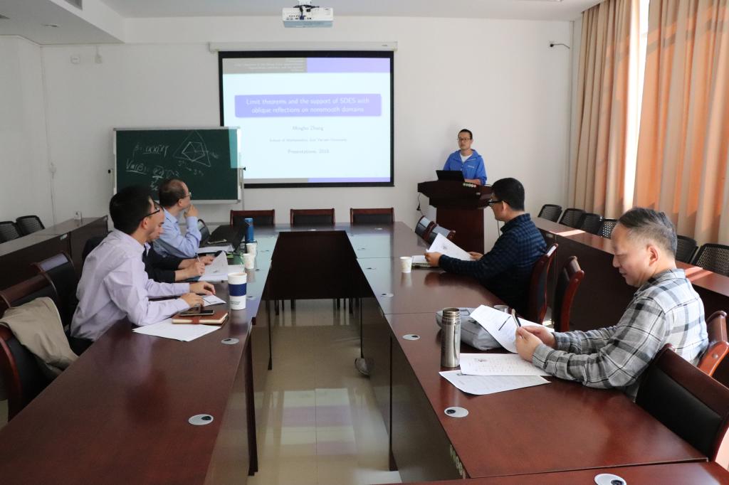 张明波博士报告主题为“非光滑区域上的斜反射随机微分方程的极限定理和支撑”,研究了两类区域条件下的斜反射随机微分方程解可由一类常微分方程的解来逼近,并讨论方程解的支撑问题。