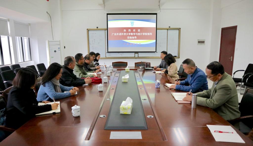 12月12日,院长王军威、党总支书记苏冬燕、副院长袁媛、马庆华教授、刘建熙教授、张振华副教授、院办主任毛竹等赴广东财经大学统计与数学学院进行调研,受到该院胡桂武院长和王伟书记的热情接待。调研会上,胡桂武院长从学院概况、学院定位与发展思路、围绕本科教学的工作举措与成效、存在的问题与改进等方面做了详细的介绍,王伟书记就该院党建工作特色做了介绍;随后,双方就本科教学、专业建设、数学建模竞赛的培训与师资方面进行了广泛而细致的探讨。
