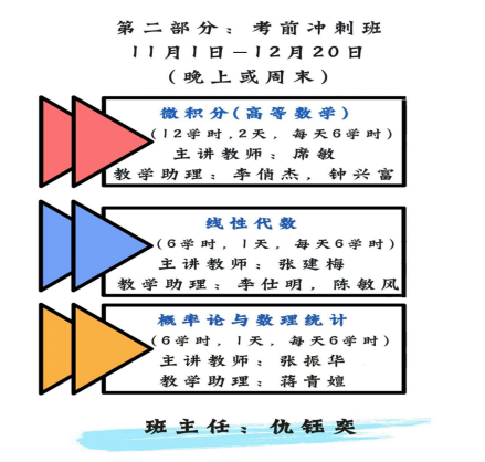 广外考研数学辅导班是由数统学院集优质教师团队倾力打造,旨在满足本科生升学深造对大学数学学习的高质量需求,不断提升学生的就业质量和就业层次,也是我院开展大学数学系列课程教学改革的积极探索和有益尝试。我院承担全校数学和统计学公共课(包括微积分,高等数学,线性代数,高等代数,概率论和数理统计等)的教学工作,学院教师对我校学生的数学基础和学习情况非常了解。因此,为给同学们提供有针对性且个性化的考研辅导培训,学院专门组建了长期奋战在教学一线、有着丰富课堂教学和考研教学经验的老师组成本次考研数学辅导教学团队,此外还配备了近年引进的年轻博士作为考研数学辅导助教团队。