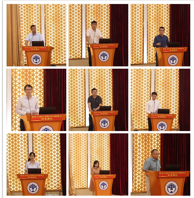 典礼还特邀了三位嘉宾发言。桂征辉本科毕业于北大数学系,他从自身的学习工作经历及数学专业就业概况等向大家娓娓道来,他指出,如果能学好数学统计专业足以站在“鄙视链”的顶端,他鼓励同学们学好内功,练就核心技能。同时,他也特别强调要提升抗挫折能力,遇到困难不要急,保持好心态。萧展航希望新生增强4C能力(Communication沟通力、Collaboration合作力、Creativity创新力、Critical thinking批判性思维能力)使自己更强壮,提升获得幸福的能力。李澔东向在场同学推荐了《时间简史》《未来简史》《AI极简经济学》等书籍,他介绍了人工智能行业前沿情况,让同学们为选择数学和统计专业充满信心,他鼓励同学们积极考研深造,多读书,读好书。领导嘉宾的发言高大上又接地气,为新生增强了专业学习的信心,端正了学习的态度,树立了远大的目标。