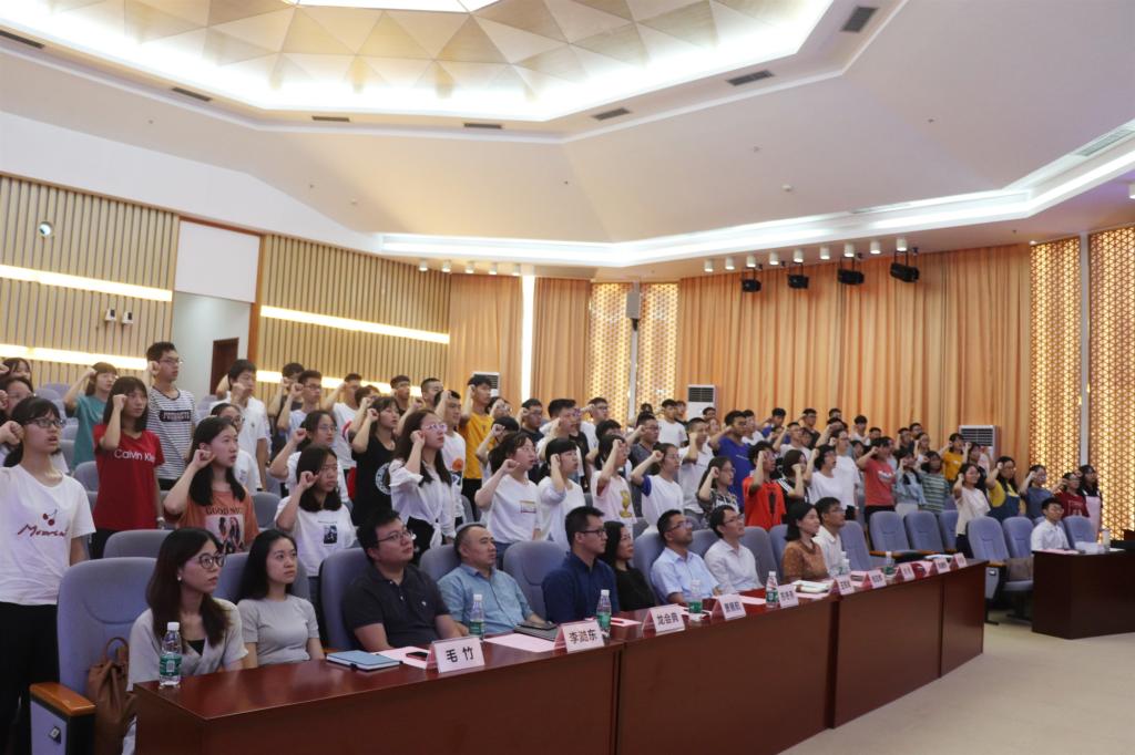 老生代表谢介民在发言中激励同学们在广外这一新的起点上奋起耕耘,不断进步,一如既往地追求知识,积极参加社团活动,在广外度过开心又有意义的每一天。新生代表冯缘建议同学们从设想毕业典礼开始,带领全体同学大胆的畅想大学生活,设想对大学生活的憧憬与计划,并带领全体2019级新生宣誓。