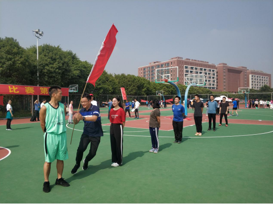 在院长、书记的带领下,我院有近20名教职工参与趣味运动会。共同参与了鸳鸯背瓜、网球颠球、集体跳大绳、单脚火车跑、运球跳绳接力赛、袋鼠跳接力赛、投球进篮、往返接力运球上篮、绑腿跑和红旗飘飘等项目。参赛教职工在各个项目中通力合作,尽情享受趣味运动带来的快乐。
