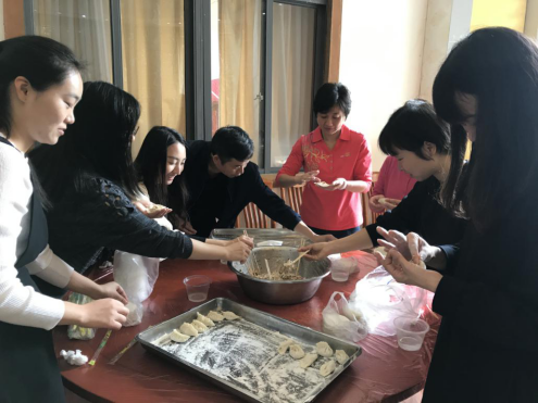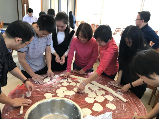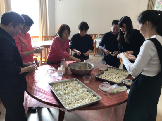 活动开始后,学院教职工分工合作,迅速进入状态,开始和面、擀皮、调制饺子馅、包饺子……伴着轻音乐,大家在欢声笑语中彼此分享着包饺子的经验,现场气氛温馨欢乐。
