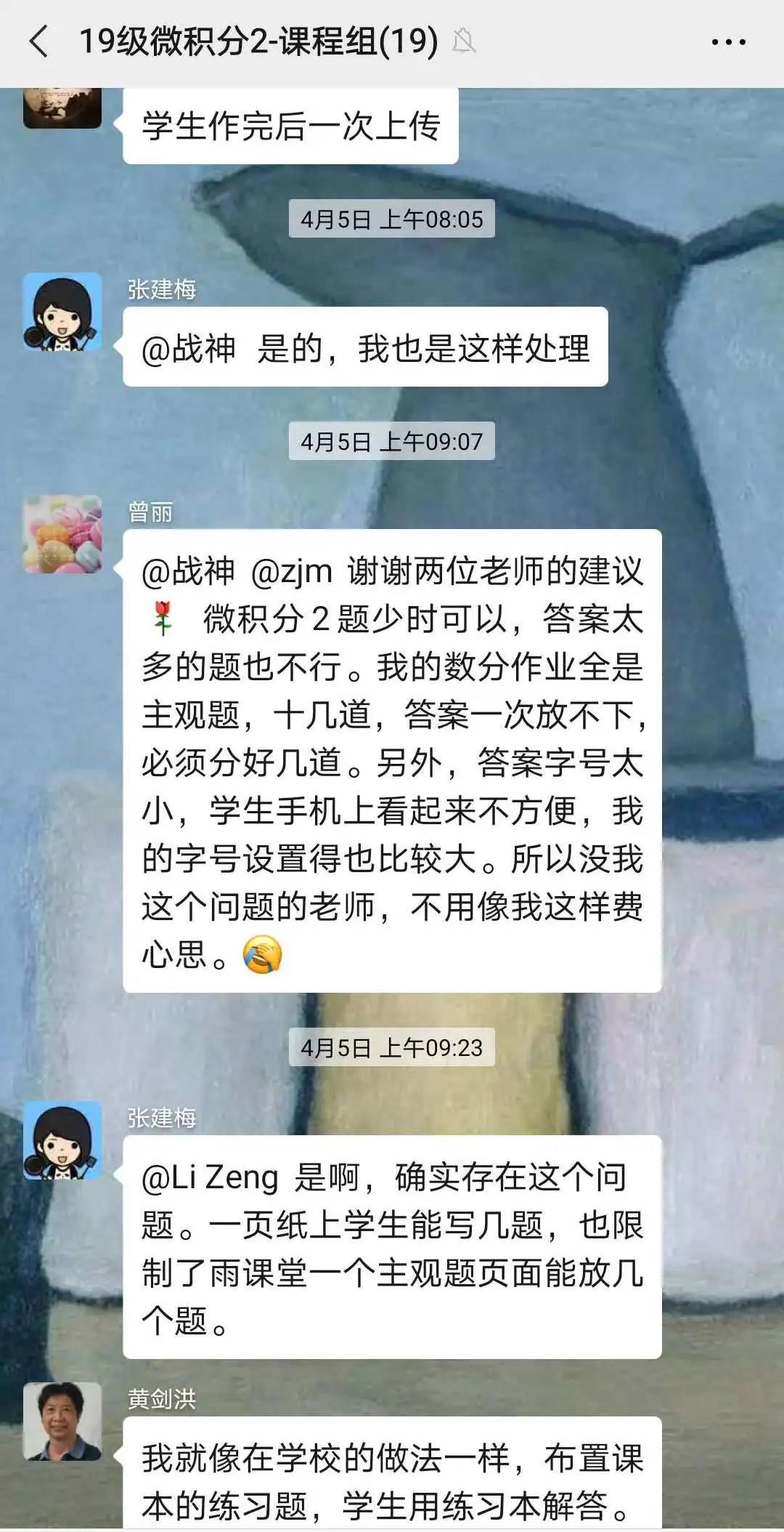 在此期间,老师们在课程微信群里热烈交流讨论,分享各种软件使用指南,共同探讨使用平台时遇到的各种问题。每位老师都积极参与,团队力量日益显现,在线教学尝试中出现的各种疑难问题逐一被解决。