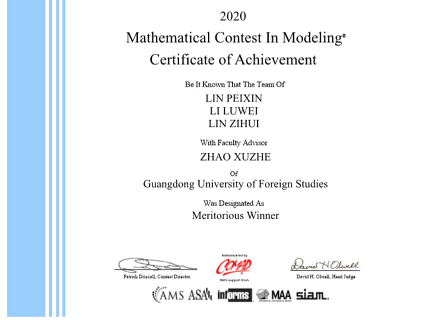 近日,2020年美国大学生数学建模竞赛(MCM)/交叉学科建模竞赛(ICM)获奖名单在其官网揭晓,我校共组建42支队伍参赛全部获奖,其中获特等奖提名奖1项(Finalist),一等奖2项(Meritorious Winner),二等奖14项(Honorable Mention),三等奖25项(Successful Participant)。受疫情影响,今年比赛分为2020年2月13-17和3月5-9日2个阶段进行,我校学子克服疫情困难,在参赛队伍和获奖成绩均较往年大幅提升,刷新了我校在该项竞赛的获奖记录。