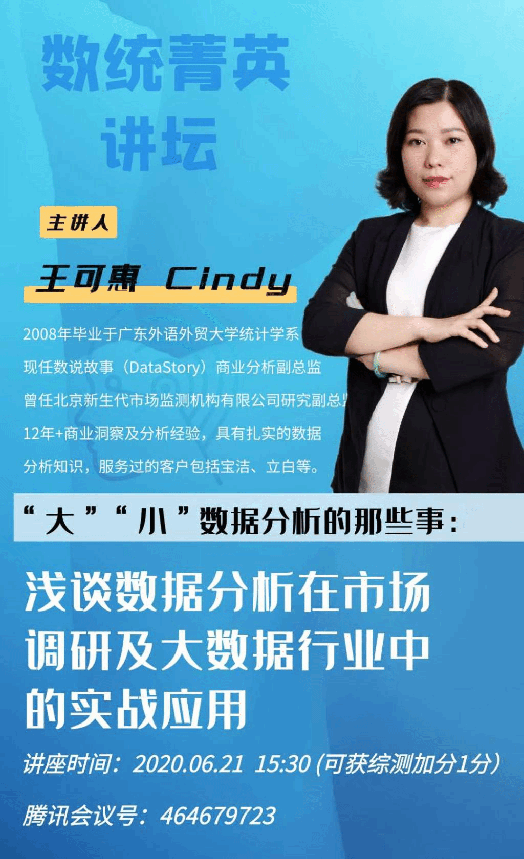 6月21日下午,数说故事信息科技有限公司商业分析副总监、我院2008届统计学专业校友王可惠女士做客数统菁英论坛,作题为《数据分析在市场调研及大数据行业中的实战应用》的报告。会议由学院党总支副书记余海波主持,近百名学子在腾讯会议平台参会。