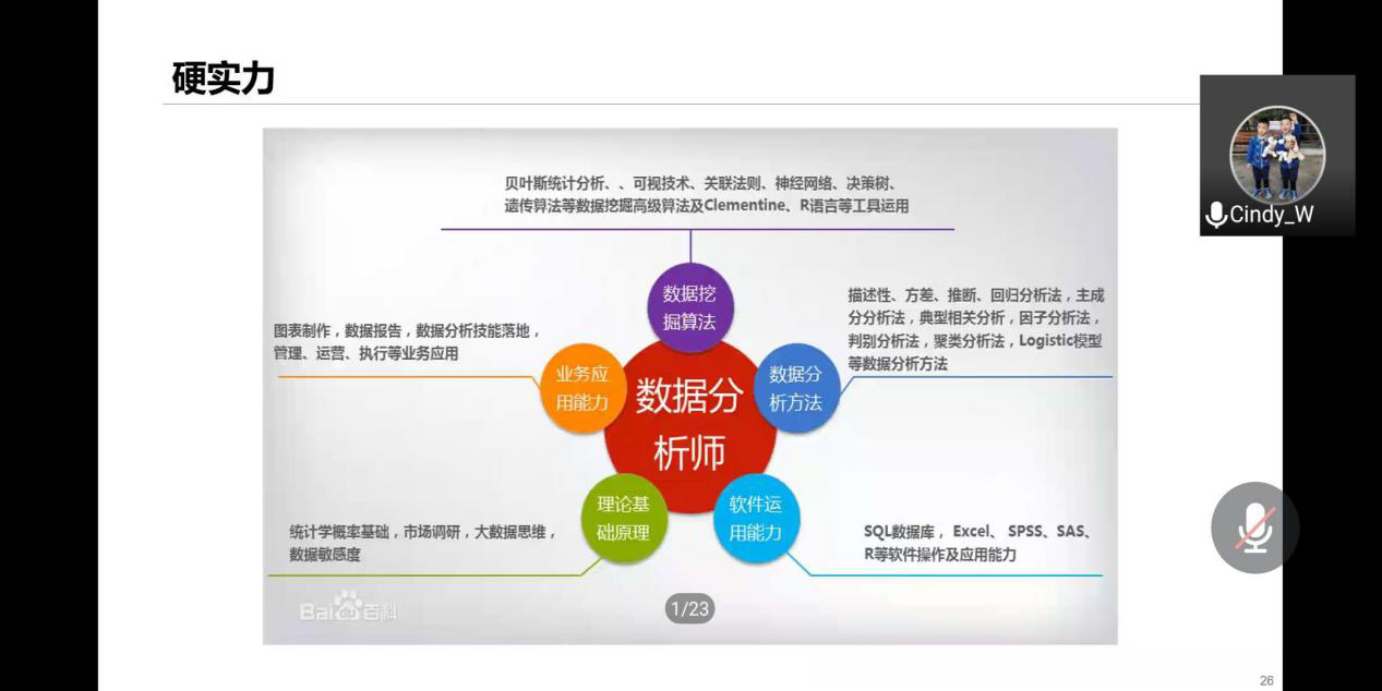 她从2020年新冠疫情的影响引入,指出不少行业低迷,企业倒闭,失业和待业人群持续走高,但数据分析师的需求不降反增,成为这波逆流中的黑马。无论是作为甲方企业的传统消费品企业、移动通信还是金融保险,互联网公司,还是作为乙方的市场研究公司等都对商业分析师、数据科学家等人才具有旺盛的需求。