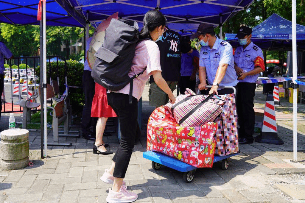 返校学生在现场工作人员的指引下有序排队,依次进行身份验证、行李消杀、体温检测、健康码和通信行程卡核验,审核合格后进入校园。学院辅导员、志愿者在报到点热情迎接返校学生,询问学生情况,发放防疫物资,帮助搬运行李,整个返校过程秩序井然。