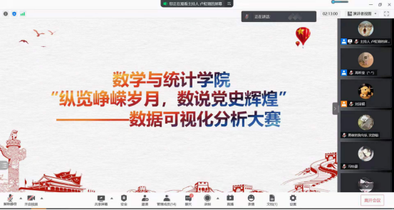 为庆祝中国共产党成立100周年,推进党史学习教育深入开展,数学与统计学院立足专业特色,将党史学习和学生专业学习相融合相促进,于7月16日下午举办了“数说党史”数据可视化大赛。本次大赛旨在引导全体同学运用所学专业知识在进行数据查找、数据分析、数据可视化,将所学知识切实运用到党史学习中去。学院党总支副书记杨博、教师党支部书记钟兴富、学院办公室主任毛竹、辅导员薛达等老师和校优秀学生党员担任评委。全院共有30支队伍150多名同学参与了本次比赛活动。