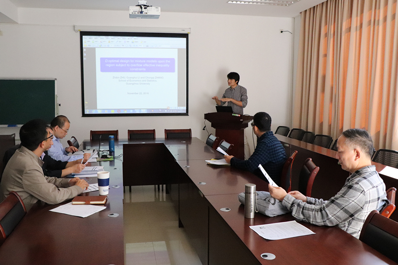 朱志彬博士分享了题为“D-optimal design for mixture models upon the region subject to overflow effective inequality constraints”的学术报告,内容属于统计分析的分支-抽样调查与试验设计,研究了最优回归设计方法的混料配方设计加复杂约束的情境,设计方法和最优设计计算机算法。