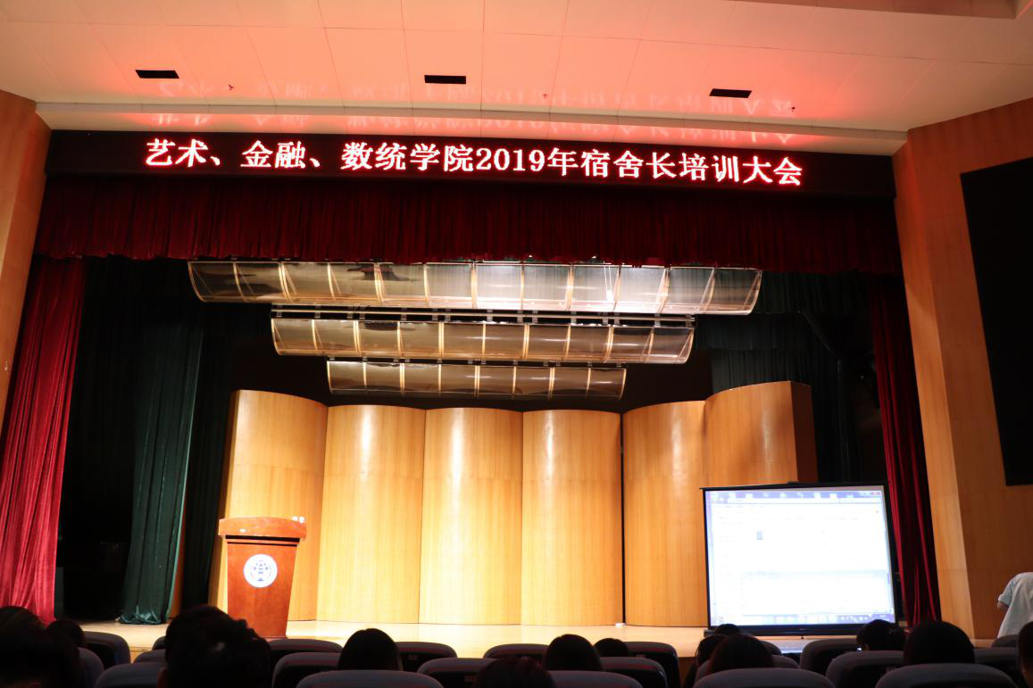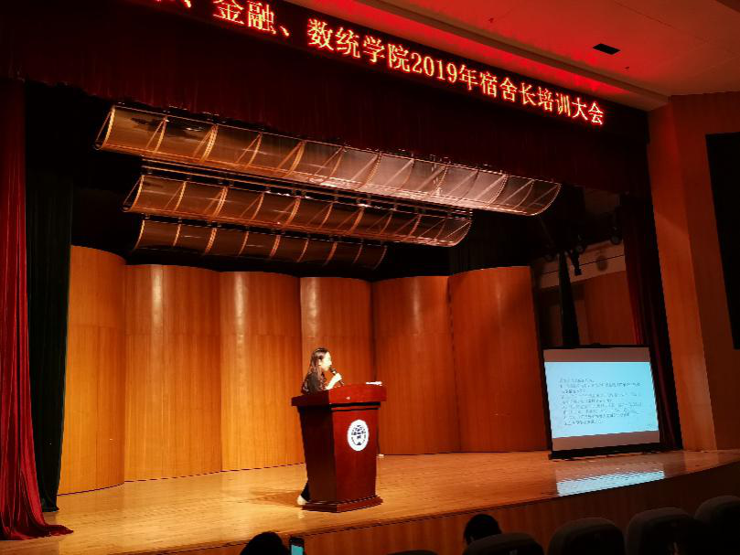 2019年11月15日19:00,艺术、金融、数学与统计学院2019年宿舍长培训大会在艺术学院小剧场举行。门诊部杨春娜主任、小谷围派出所驻校民警邱警官、艺术学院辅导员邓煜、数统学院辅导员陈宣惠及学生宿舍自律委员会的杨巧玲分别进行了专题讲解。