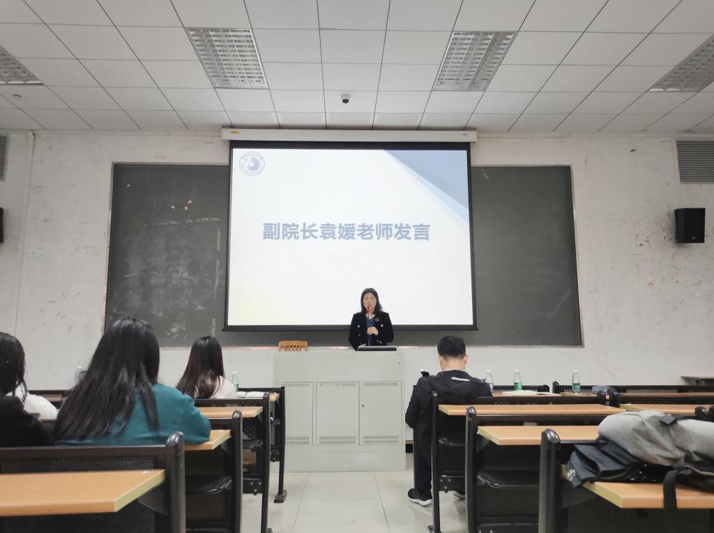 随后,进入大会的第二部分——学风建设之诚信考试动员大会。袁媛强调了学风建设和诚信考试的重要性,提醒同学们要了解修订后的本科生课程考核管理规定,并讲解了教学实践周和毕业实习的注意事项。最后,她鼓励同学们提前有序地做好学业规划。辅导员陈宣惠、薛达则进行了考勤、晚归情况的通报,强调学风考风重要性。
