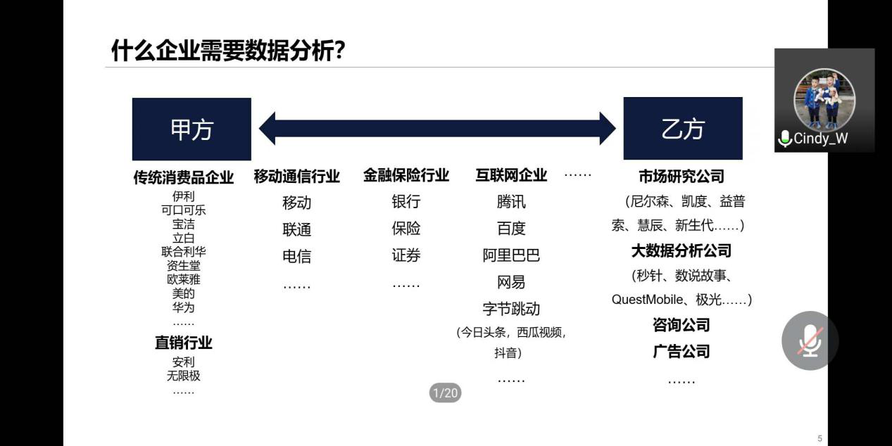 她从2020年新冠疫情的影响引入,指出不少行业低迷,企业倒闭,失业和待业人群持续走高,但数据分析师的需求不降反增,成为这波逆流中的黑马。无论是作为甲方企业的传统消费品企业、移动通信还是金融保险,互联网公司,还是作为乙方的市场研究公司等都对商业分析师、数据科学家等人才具有旺盛的需求。