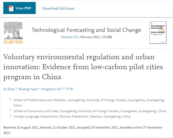 近日,我院云山青年学者周迪副教授指导2019级本科生原爽撰写的论文《Voluntary environmental regulation and urban innovation: Evidence from low-carbon pilot cities program in China》在商学类及区域与城市规划类SSCI一区期刊《Technological Forecasting & Social Change》(影响因子8.193,ABS三星)在线发表,论文第一作者为周迪,第二作者为原爽,实现了我院本科生在SSCI一区期刊发表论文零的突破,标志着我院教育教学水平及人才培养质量迈上了新的台阶。