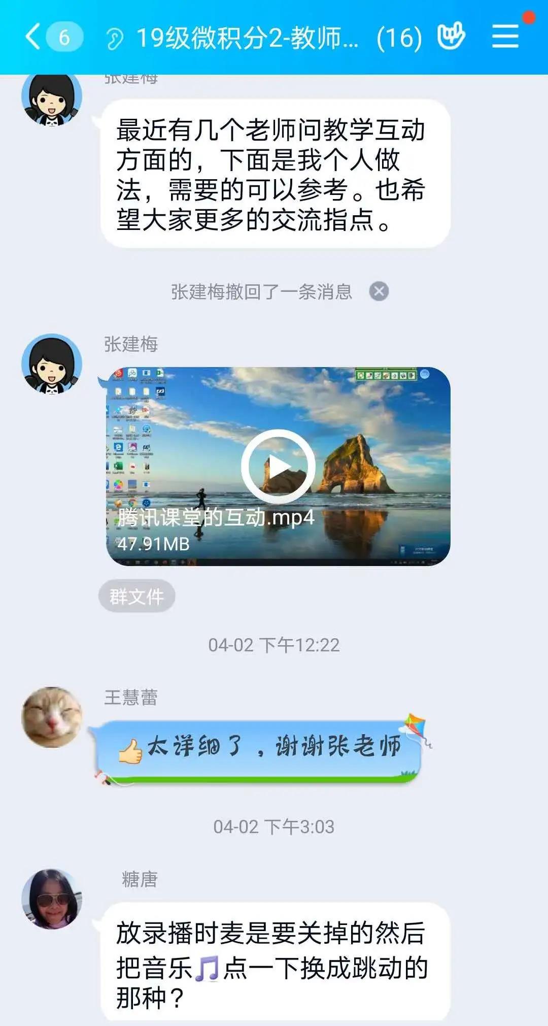 在此期间,老师们在课程微信群里热烈交流讨论,分享各种软件使用指南,共同探讨使用平台时遇到的各种问题。每位老师都积极参与,团队力量日益显现,在线教学尝试中出现的各种疑难问题逐一被解决。