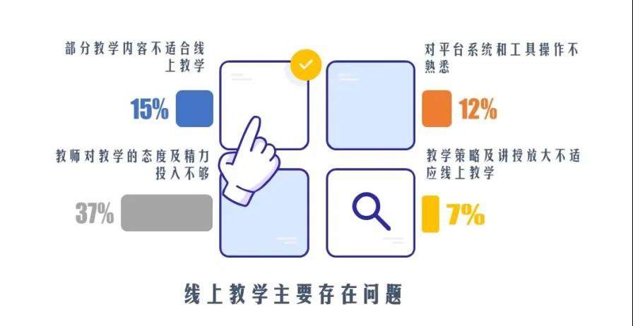 调查问卷的结果显示,大部分学生对教学效果表示满意,目前上网课遇到的困难主要集中在“网络速度及稳定性差,对平台系统和工具操作不熟悉,部分教学内容不适合线上教学”,部分学生也提出了具体的意见和建议,例如网课没有像真正上课那样容易听懂和理解,真实上课会有很好的氛围带动等等。