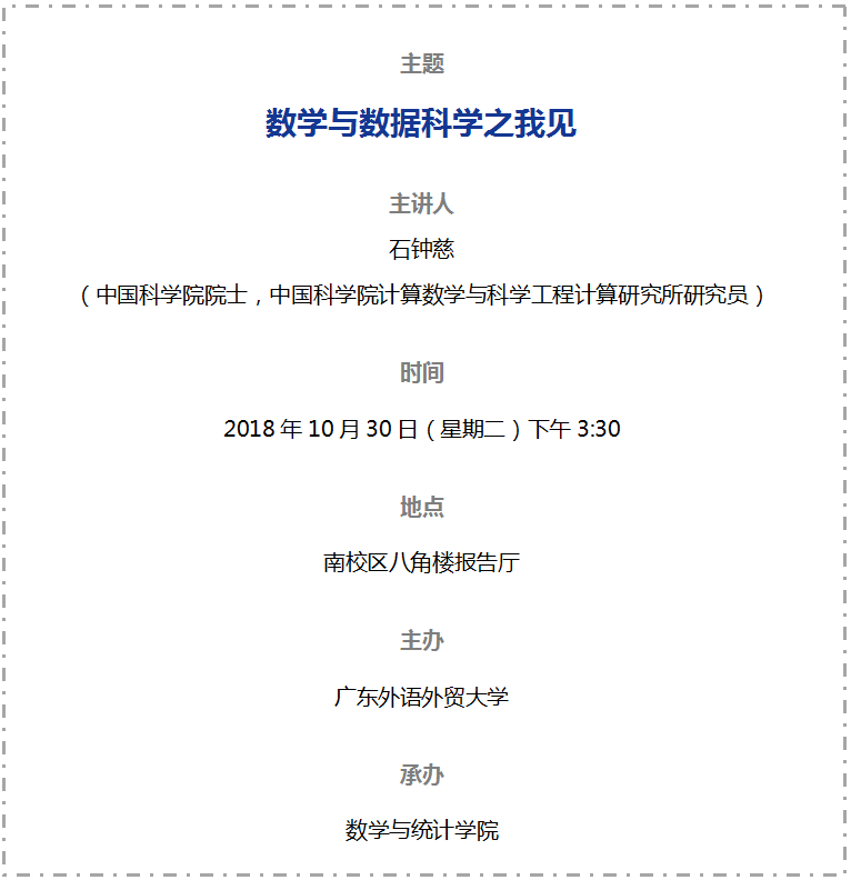 石钟慈院士将以数学科学分类为切入点,用通俗语言剖析国内外数学科学的类型以及数学科学与数据科学的差别。在回顾计算数学大发展历史的同时,他将深入浅出地介绍大数据的主要特征、应用前景,引导当代大学生拥抱数学科学,学会使用大数据,学会有效地分析处理大数据,将个人与社会联系起来,实现人生价值。