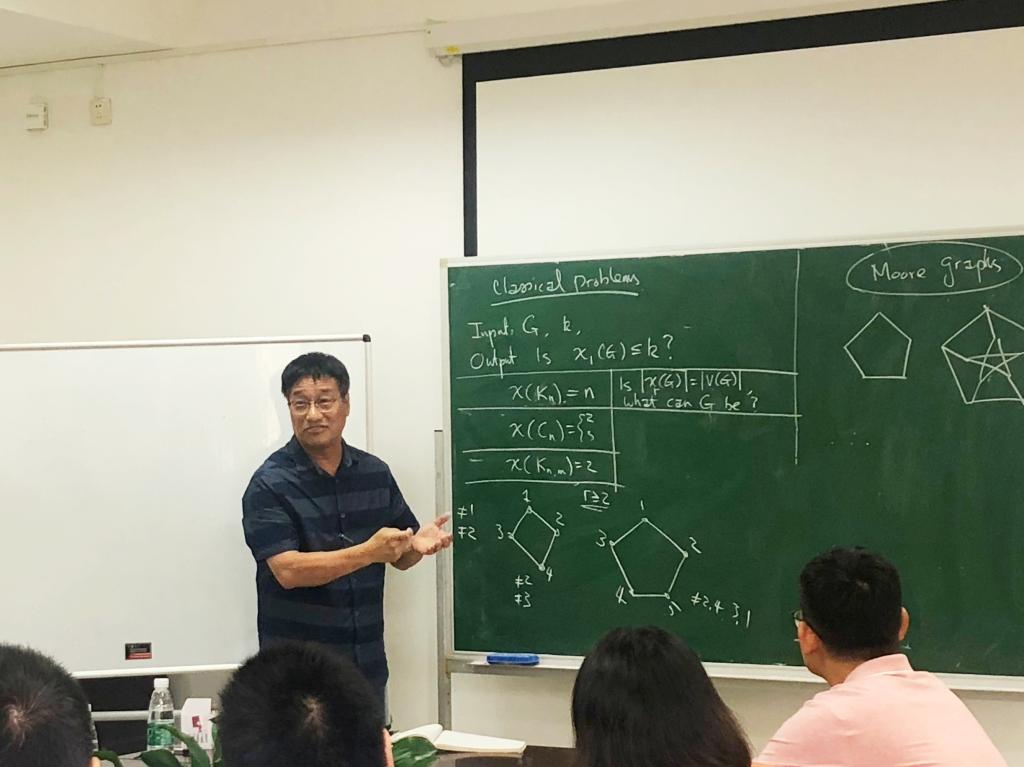 讲座中,赖虹建教授从图论中的多彩染色问题起源出发,结合自己丰富的研究经历,讲述了图的多彩染色定义和初等性质、平面图的多彩染色和嵌入到曲面上的图的多彩染色问题、禁用导出子图的多彩染色问题、古典染色和多彩染色数的比较,以及多彩染色的敏感度问题。在展开讨论这些问题的同时,赖虹建教授也介绍和总结了解决该染色问题的各种方法,如构造法、归纳法、充放电方法、Lebesgue分布方法、随机方法、构造性算法等,他结合自己多年的研究心得为与会师生展示了科学研究的体系和思路,并为大家带来了许多未解决的问题。在这为期两天的4场专题系列讲座结束后,与会师生纷纷表示,赖教授严谨的科学精神深深地感染了自己,同时,赖教授对于研究内容、方法的讲解也让人受益匪浅。
