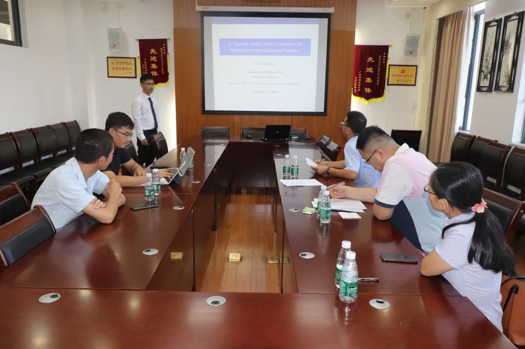 澳门大学温朝涛博士则以“A two-step inexact Newton-Chebyshev-like method for inverse eigenvalue problems”为题作报告。为解决一类特征值反问题,他提出了一套两步非精确 Newton-Chebyshev型方法。与两步非精确Newton型方法可能出现非预期不稳定不同,该方法利用Chebyshev方法逼近雅可比矩阵的逆,从而保证数值稳定性。
