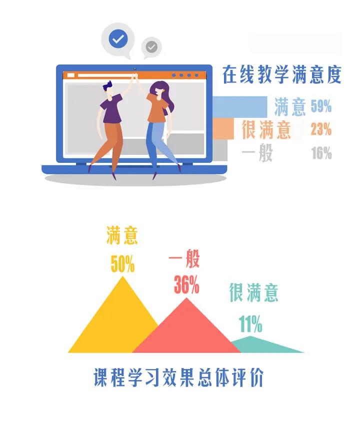 调查问卷的结果显示,大部分学生对教学效果表示满意,目前上网课遇到的困难主要集中在“网络速度及稳定性差,对平台系统和工具操作不熟悉,部分教学内容不适合线上教学”,部分学生也提出了具体的意见和建议,例如网课没有像真正上课那样容易听懂和理解,真实上课会有很好的氛围带动等等。