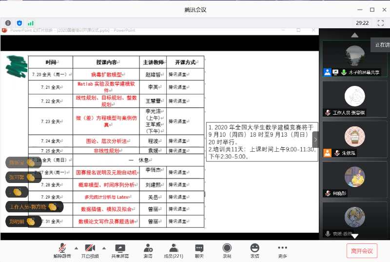 为提升学生学术创新能力,备战2020年9月全国大学生数学建模竞赛,数统学院学生品牌科技创新活动“全国大学生数学建模竞赛暑期培训”于7月20日启动。袁媛副院长、数学类学生课外创新活动负责人李俏杰老师以及数学建模教学团队老师参加了培训班开班仪式。为配合常态化疫情防控措施,今年学院首次采用腾讯课堂的“云端”培训,突破地域和空间的限制,参加培训人数创新高,吸引了来自数统学院、经贸学院、金融学院、会计学院、商学院、信息学院等210名同学参加培训(部分学院因考试未参加)。学院提前筹划设计,李俏杰老师积极组织落实,应用数学研究协会同学热情协助,数模团队老师精心准备,即将为同学们奉献上11天的数学建模大餐。