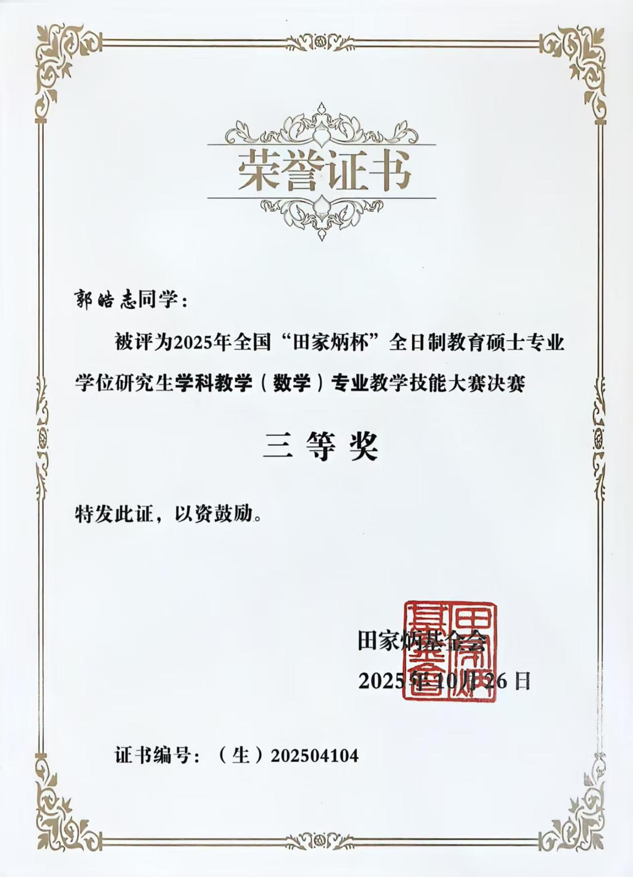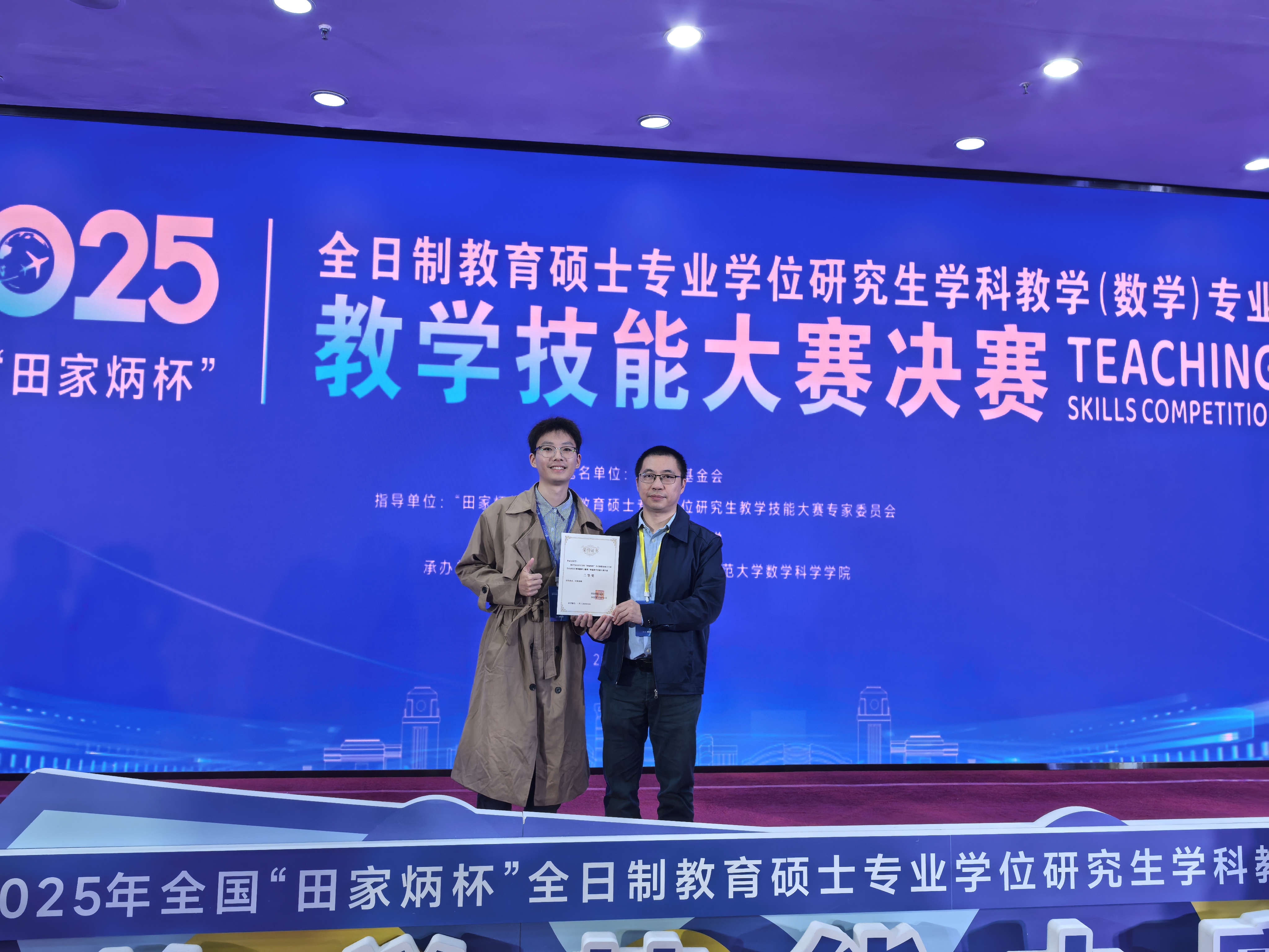 本网讯 2025年10月26日,全国“田家炳杯”全日制教育硕士专业学位研究生学科教学(数学)专业教学技能大赛决赛在四川省南充市西华师范大学落下帷幕。我院2024级研究生郭皓志凭借出色表现,荣获全国三等奖。