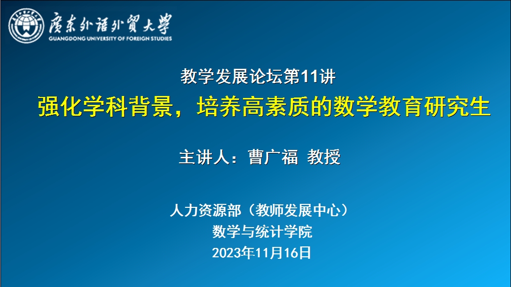 请有兴趣参与本次讲座的老师于11月16日前登录智慧广外,在可用应用中搜索“继续教育管理”,在个人主页中点击“教学发展论坛第11讲:强化学科背景,培养高素质的数学教育研究生”讲座名称进行网上报名。讲座后将会登记继续教育学时(需在会前进行网上报名并现场联系工作人员签到),如有疑问,请致电教师发展中心,联系电话:36641382(短号:2382)。