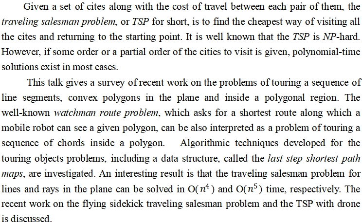 主题:New algorithms for touring a sequence of convex objects(有序凸体的遍历算法研究)