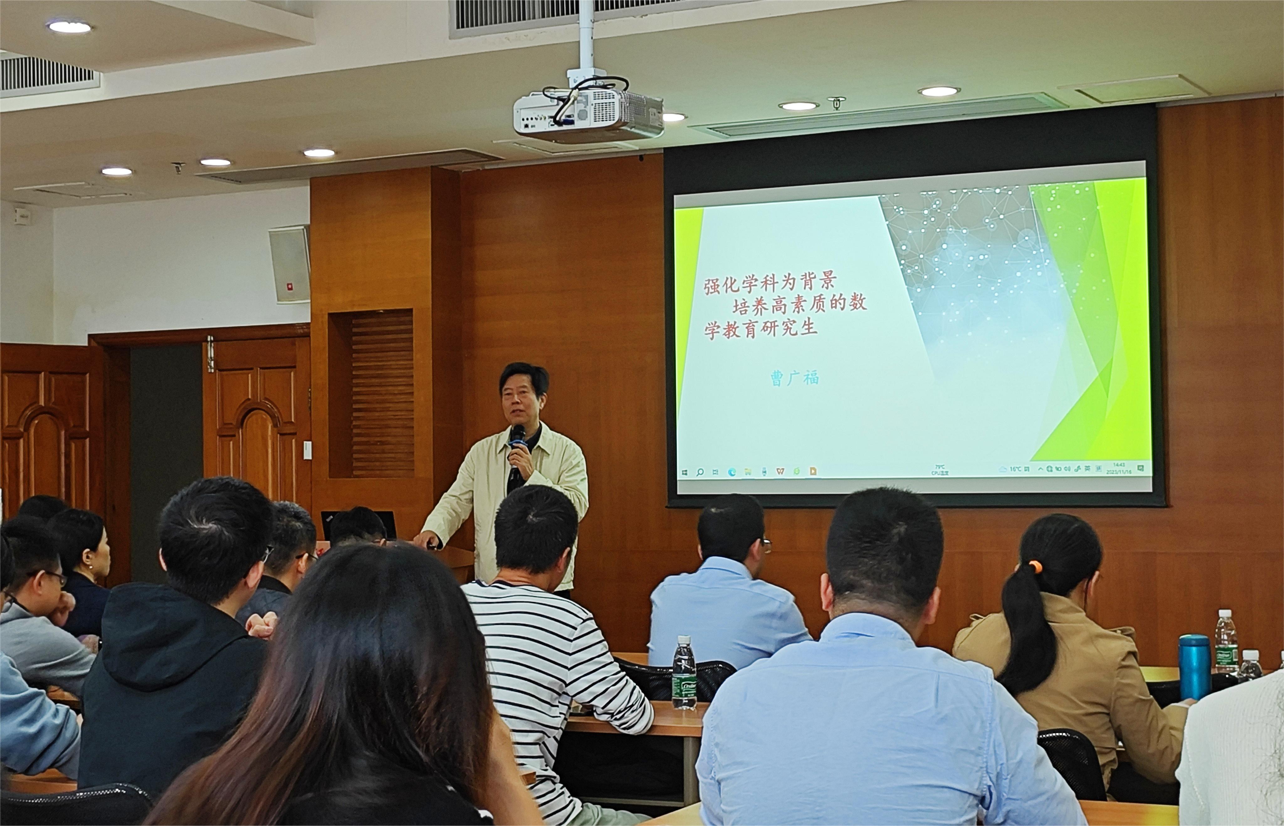 本网讯 为全面落实研究生导师立德树人职责,加强导师队伍建设,提升我院研究生培养质量,11月16日下午,由人力资源部(教师发展中心)主办、数学与统计学院承办的“教学发展论坛第11讲”暨数统学院研究生导师培训会,在大学城校区校办公楼第六会议室举行,国家教学名师、广州大学曹广福教授以“强化学科背景,培养高素质的数学教育研究生”为题,为我院学科教学(数学)教育研究生导师开展专题培训。学院领导班子成员、我院硕士研究生导师等60余位师生参加了本次讲座,讲座由院长王军威教授主持。