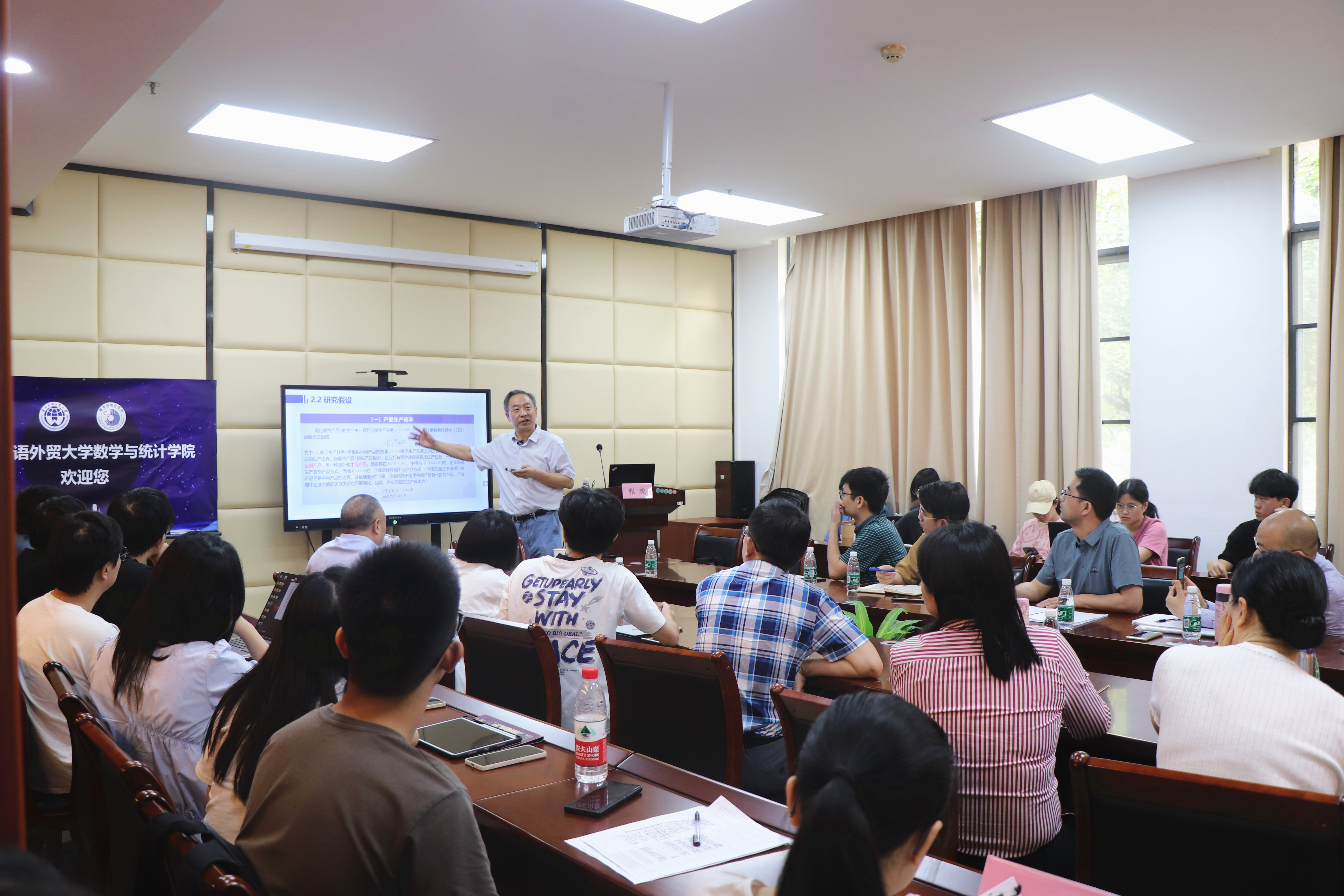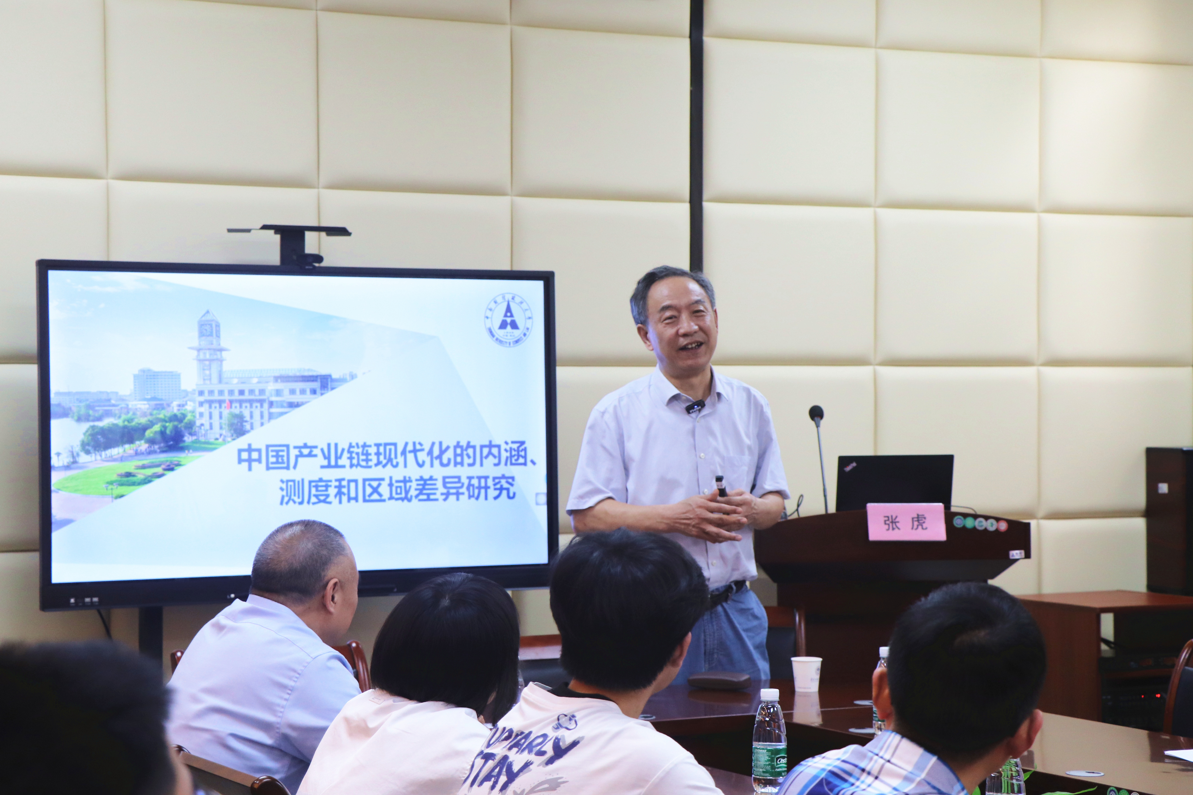 本网讯 4月20日下午,由人力资源部(教师发展中心)主办,数学与统计学院承办的著名教授论坛第583讲暨数统学院“前沿学术论坛”第24讲,在南校区院系楼152会议室举行。此次论坛邀请到了中南财经政法大学统计与数学学院院长张虎教授作为主讲人,讲座主题为“中国产业链现代化的内涵、测度和区域差异研究”。本次论坛由数学与统计学院院长王军威教授主持,校内五十余名师生参加了此次论坛。