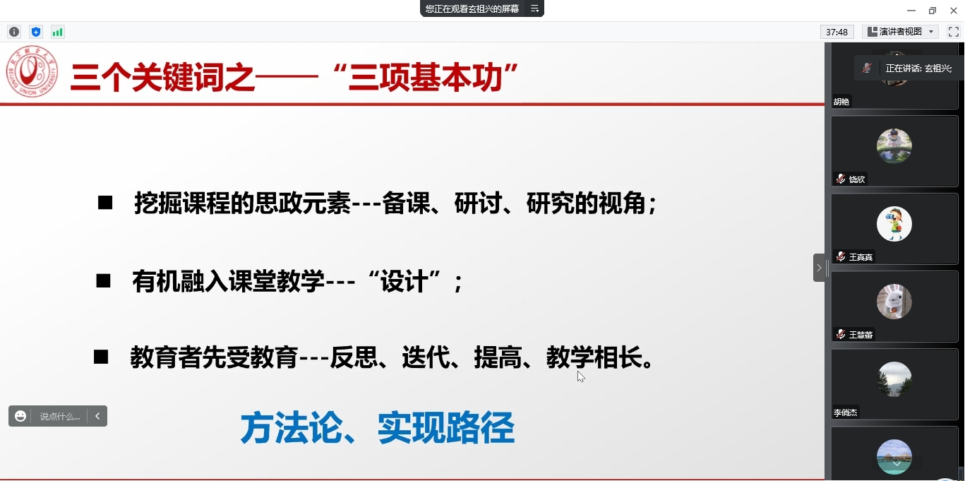 报告临近尾声,与会教师积极参与交流互动,就教学大纲改进的调整方向、教学成果的跨校共建共享、教学成果转化等相关议题做深入探讨。此次报告为一流课程背景下我院的大学数学课程改革提供了有效的指导,给我院教师提供了一个宝贵的学习机会,参加报告的教师均表示受益匪浅。