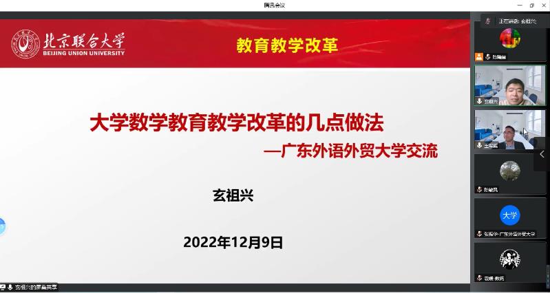 本网讯 12月9日下午,北京联合大学博士生导师、北京交叉科学学会副秘书长玄祖兴教授应邀为我院教师做了题为“大学数学教育教学改革的几点做法”的精彩报告。该报告由数学与统计学院主办,院长王军威教授担任主持人。