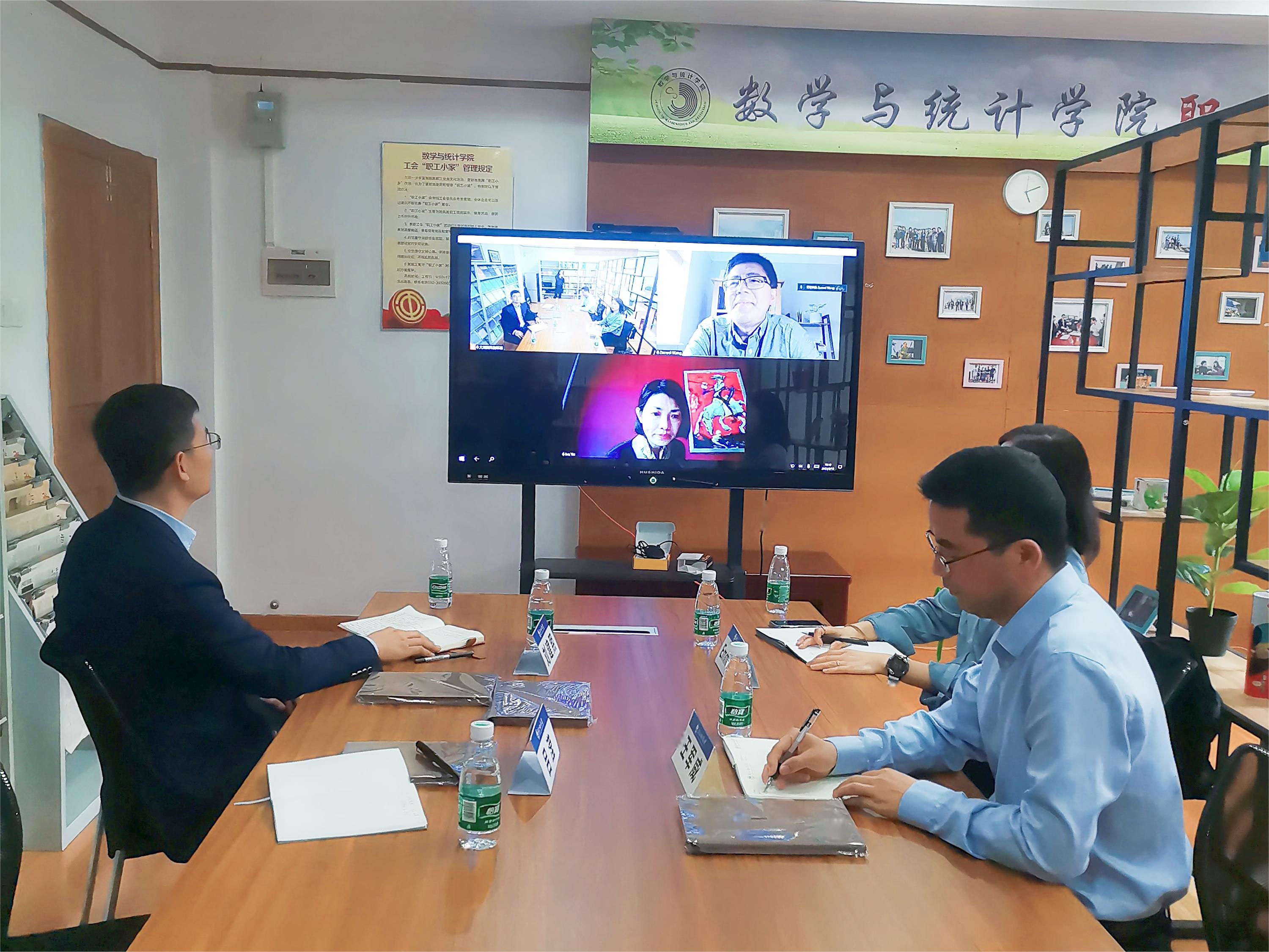 双方围绕国际合作项目工作进行座谈交流,雷丁大学数学与统计系Zuowei Wang教授和Iva Yu老师通过视频线上参会。王军威对雷丁大学来宾表示热烈欢迎,并介绍了我院的学科建设、师资队伍以及与雷丁大学合作开设的2+2本科双学位项目数学与应用数学(国际创新班)的进展,希望继续在教师访学、合作科研、硕士学位项目等方面开拓更多的合作领域。Emma Liu表示非常高兴看到双方合作项目进展顺利,接下来将尽力推进双方开展多方位深层次的合作。Zuowei Wang和Iva Yu肯定了双方在本科双学位方面的合作,介绍了当前数统系正在进行的专业教学改革情况,并就大数据专业、教师访学交流等相关项目合作达成初步意向。