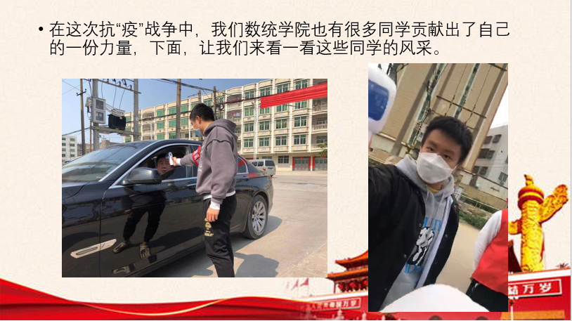 来自经济统计学1901班的樊文远同学,除了介绍国家、社会以及五湖四海的中国人民在抗疫中的无私奉献外,同时也向我们介绍了我院学子郑梓浩同学在疫情期间成为社区志愿者、担任社区的“护门人”的积极抗疫行动,号召我们即便是平凡之人也可以贡献属于自己的一份力量,也要努力做一个优秀的“广外数统人”。