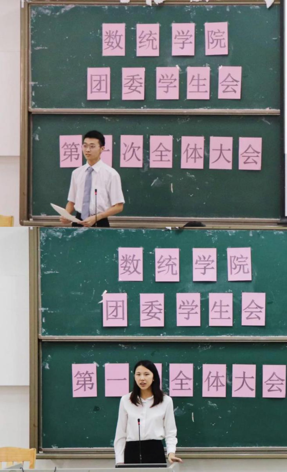 会议伊始,主持人介绍会议流程,紧接着是主席团成员发言。各位主席团成员们先是对团委学生会新成员的加入表示欢迎与感谢,然后提出了对全体成员的期待,希望大家能多与人沟通,提高与人合作、交流的能力并能不忘初心,一直坚持下去,让数统团学成为一个优秀的群体。
