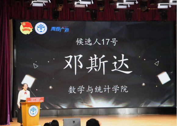 在五四青年节来临之际,学校举行第九届“青春广外·凤鸣岭南”十佳青年评选活动,我院2021级经济统计专业学生邓斯达获评十佳青年荣誉称号。