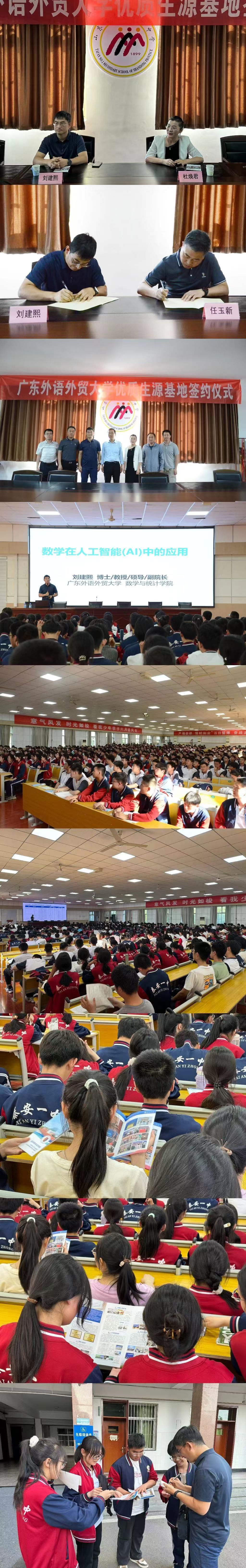 座谈会后,刘建熙以“数学在人工智能(AI)的应用”为题,面向泰安一中千余名师生开展专题讲座,并开展本科招生宣讲会。鼓励学生对数学和人工智能保持浓厚的兴趣,积极探索两个领域的交叉点。此次专题讲座不仅向学生传授了数学在人工智能应用方面的宝贵知识,也激发了大家到广外探索数学世界的热情和好奇心,为学校吸引优秀生源奠定坚实基础。讲座结束后,学生纷纷拿着报考资料,找刘建熙副院长签名留念,表示会以此为激励,脚踏实地、努力准备,争取日后进入广外学习。