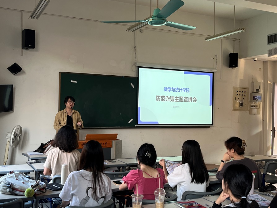 为了进一步提高学生“防诈、识诈、反诈”意识和能力,筑牢安全意识防线,11月1日下午,数学与统计学院组织2023级全体研究生开展防范诈骗主题宣讲会,邀请番禺区公安分局小谷围派出所的邱智贤警官主讲,学院党委副书记谭秋云与辅导员薛达、叶依莜、林希参会。