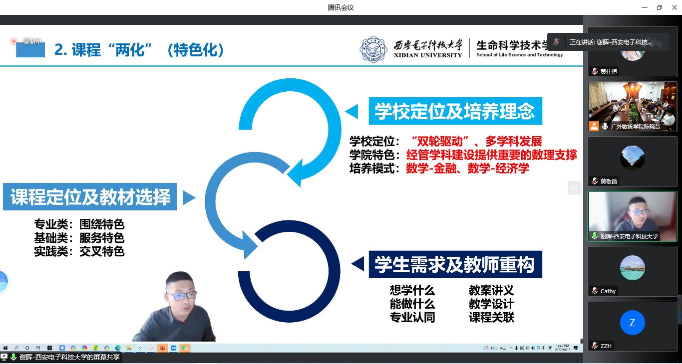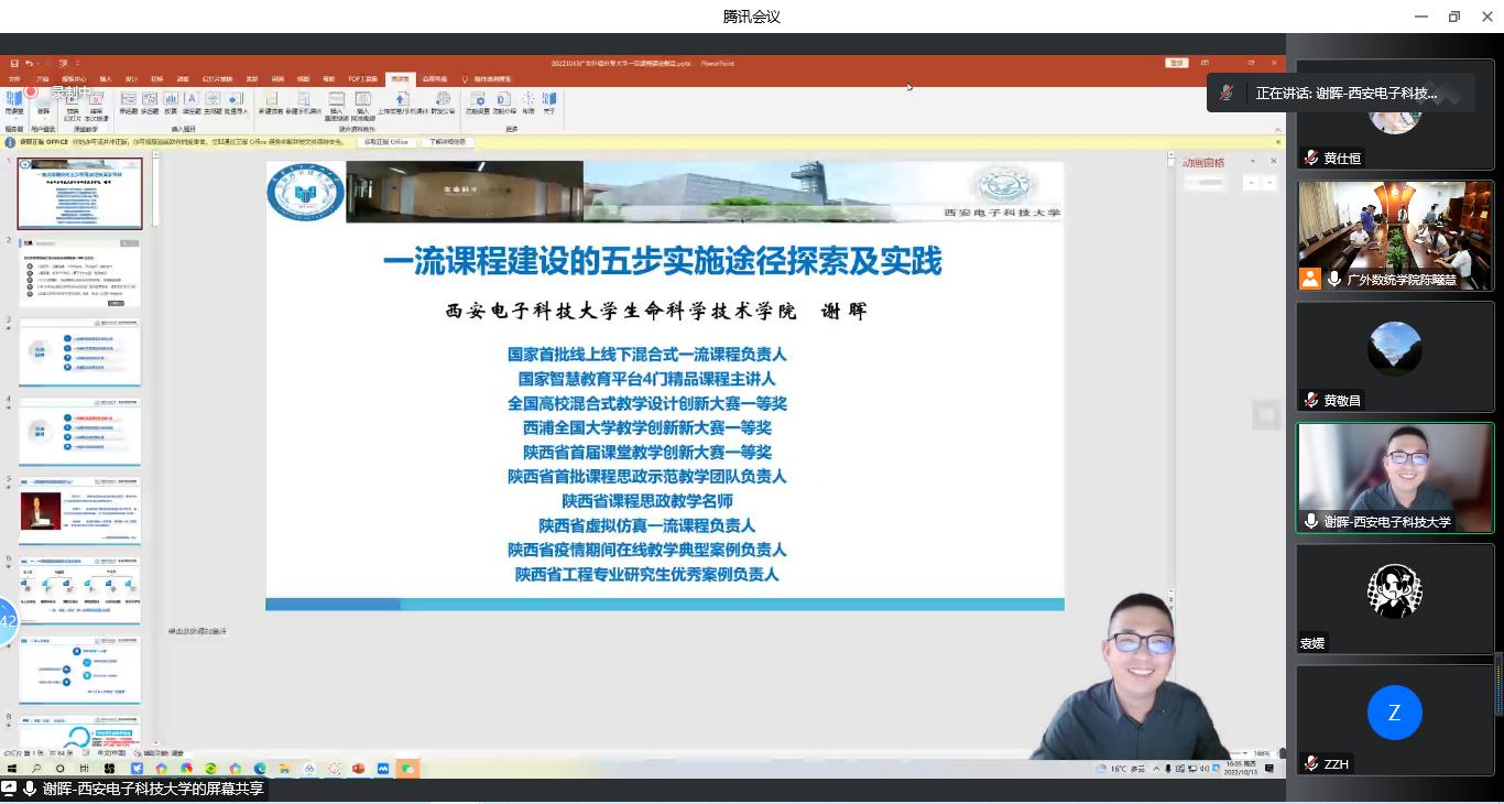 本网讯 2022年10月13日下午,由教师发展中心主办,我院承办的“一流本科课程暨课程思政建设系列讲座”第四讲在腾讯会议和南校区院系楼152会议室线上线下同步举行。国家级线上线下混合式一流课程负责人、西安电子科技大学谢晖教授为我校教师作一流课程建设与线上线下混合教学经验分享。来自我校数统学院、经贸学院、商学院、会计学院、创新创业教育学院的教师参加了本次讲座。讲座由院长王军威教授主持。