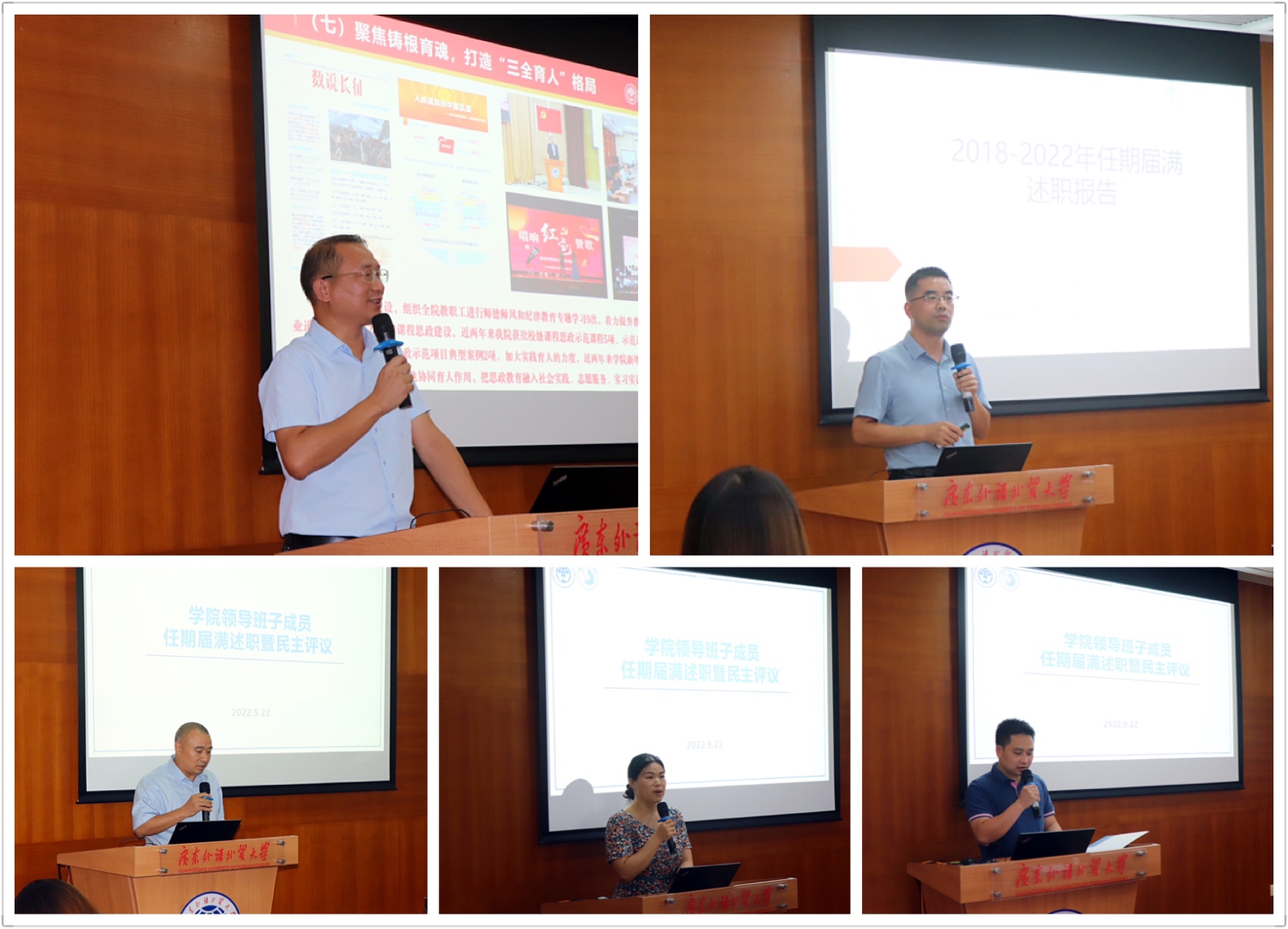 李江在会上传达了校党委关于开展2022年中层领导人员换届工作实施方案的精神,明确提出了学院班子成员任期届满述职及民主评议的要求及流程。随后,李江书记、王军威院长、龙会典副院长、袁媛副院长、杨博副书记分别对自己任职以来德能勤绩廉等各方面的情况向全院教职工述职。述职结束后,与会教职工对学院领导干部进行民主测评。