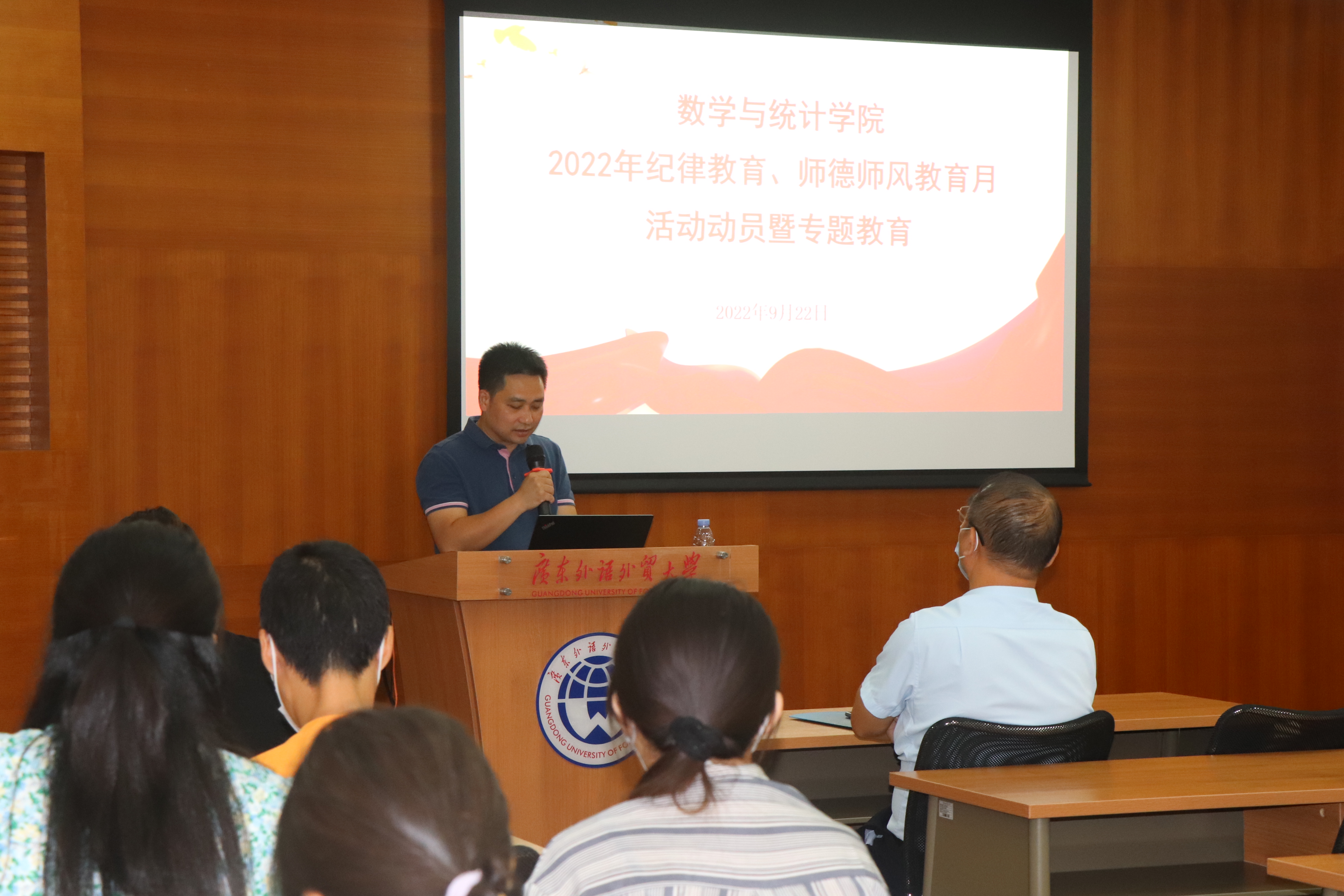 随后召开学院开展2022年纪律教育、师风师德教育月活动动员大会。杨博传达了上级相关会议和文件精神,再次领学了师德师风失范行为清单,结合案例教育,提醒全体教职工以此为戒,恪守底线,不负教书育人的神圣使命。会上,全体教职工一起观看了《家风》的视频。