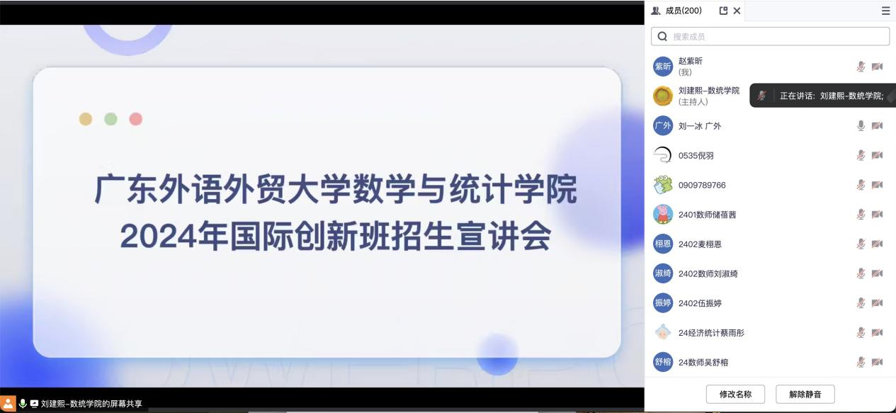 刘建熙介绍了我院与雷丁大学“2+2”国际创新班项目的具体情况。通过“2+2”双学位培养计划,学生分别在广东外语外贸大学和英国雷丁大学各学习两年,无缝对接双方核心课程,实现渐进式留学,减少文化冲击,提高学生的适应能力。刘建熙指出,本项目旨在培养具有扎实的数学与经济金融基础,了解数字经济时代的前沿动态,具备英语交际能力,能够解决金融工程、投资决策等问题的复合型金融数学人才。项目注重培养学生的国际视野和全球领导意识,通晓国际规则,积极参与国家“一带一路”倡议和粤港澳大湾区建设,为国际化人才提供广阔的发展平台。