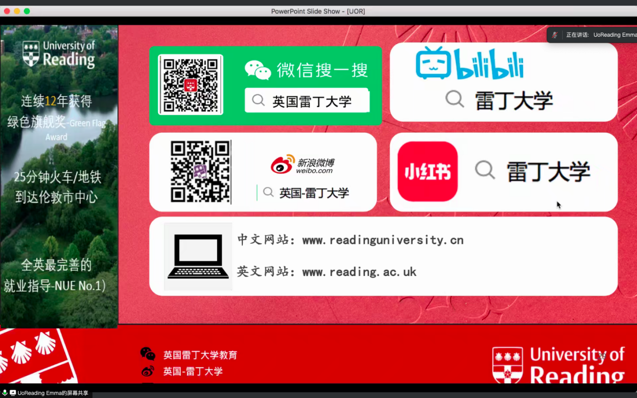 Emma Liu向同学们详细介绍了雷丁大学的基本情况,包括雷丁大学的办学历史、地理位置、教学与学术情况、入学要求、就业支持、食宿生活环境等等。