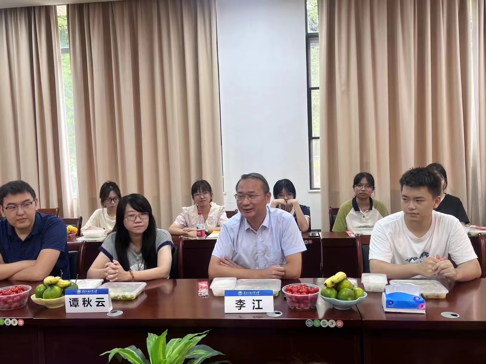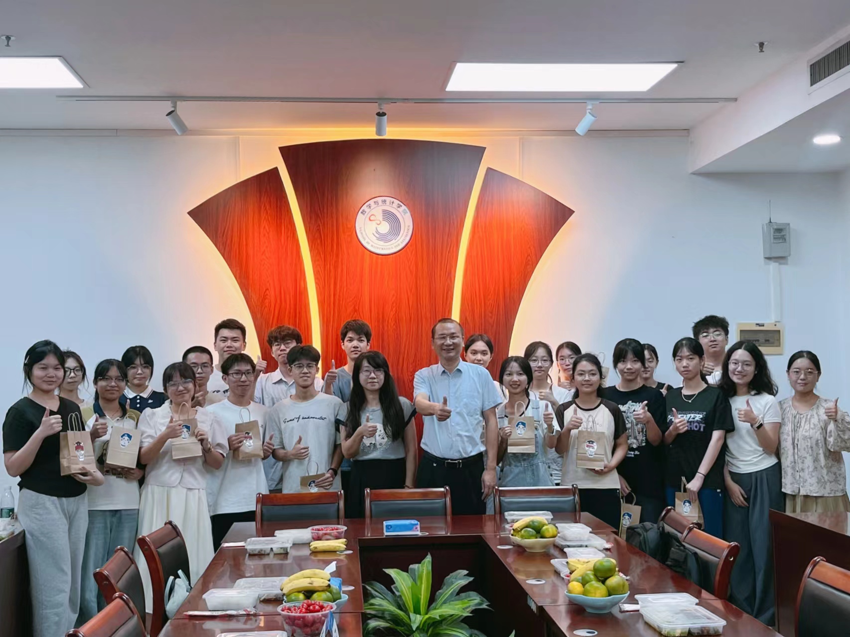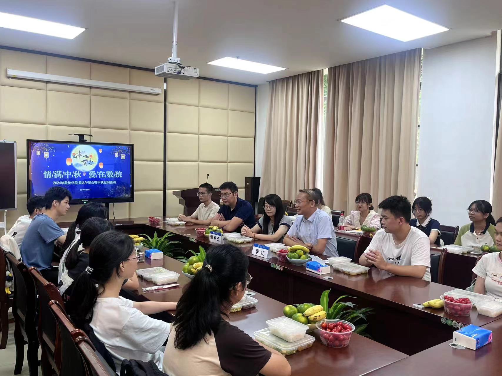 本网讯 2024年9月13日中午,数统学院“情满中秋· 爱在数统”书记午餐会暨中秋慰问活动在院系楼152会议室举行。学院党委书记李江、副书记谭秋云、学院全体辅导员及20位2024级新生代表参与此次活动。
