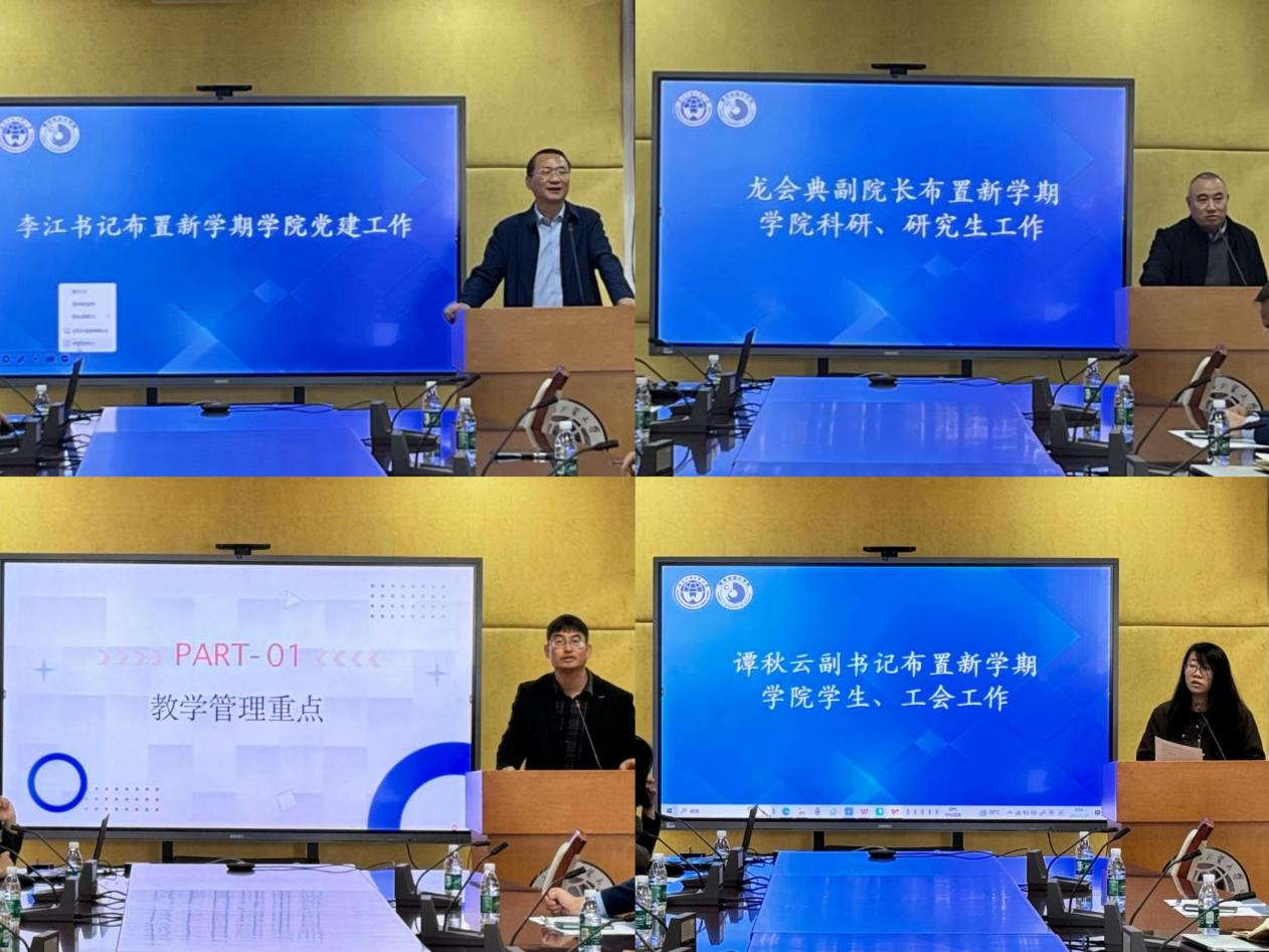 院长王军威在讲话中强调我院教师要以德立身、以研促教、以爱育人。他指出,在新学期我们要构建高效有序的学院运行机制;建设好一流专业、一流课程,推进课程数字化转型升级,继续加强学科和专业建设;抓好抓实2025年高层次教学、科研项目申报;持续推进师资队伍建设,精准引进人才;扎实开展2025年研究生招生线下宣传、招生命题等工作。