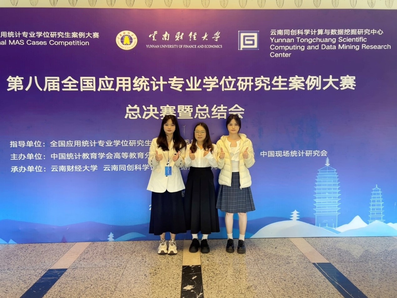 本网讯 2025年10月19日,第八届全国应用统计专业学位研究生(MAS)案例大赛在昆明圆满落幕。经过激烈角逐,由我院2024级应用统计专业研究生林熙蕾、陈青竹、林惠芬组成的参赛团队,在徐丽副教授的悉心指导下,凭借扎实的专业知识、创新的解决方案和出色的现场表现,从众多顶尖高校代表队中脱颖而出,荣获全国二等奖,展现了我院学子的卓越风采。