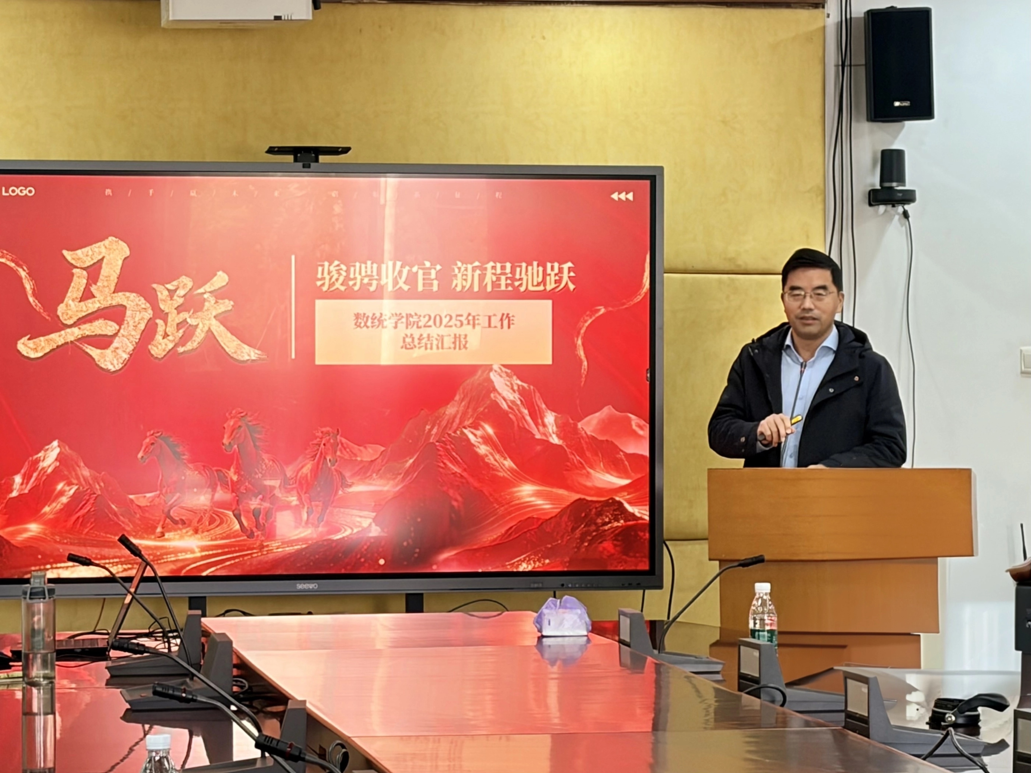 王军威代表学院作2025年度工作总结汇报。他指出,过去一年中,学院在师资建设、科研创新、学科发展、教学改革、人才培养等方面取得了一系列扎实成效。其中,师资建设持续加强,成功引进多位高层次人才,并有教师获得晋升与荣誉;科研与学科建设成效显著,获批多项国家级、省部级项目,发表高水平论文数量稳步增长,并在国际顶刊发表重要成果;教学改革取得历史性突破,首次获省级教学成果奖;人才培养方面,学生在全国乃至国际多项重要学科竞赛中表现优异,获奖数量与层次显著提升。他对还对全体教职工的辛勤付出表示衷心感谢,并鼓励大家在新的一年中继续团结奋进,共同推动学院在十五五开局之年事业发展再上新台阶。