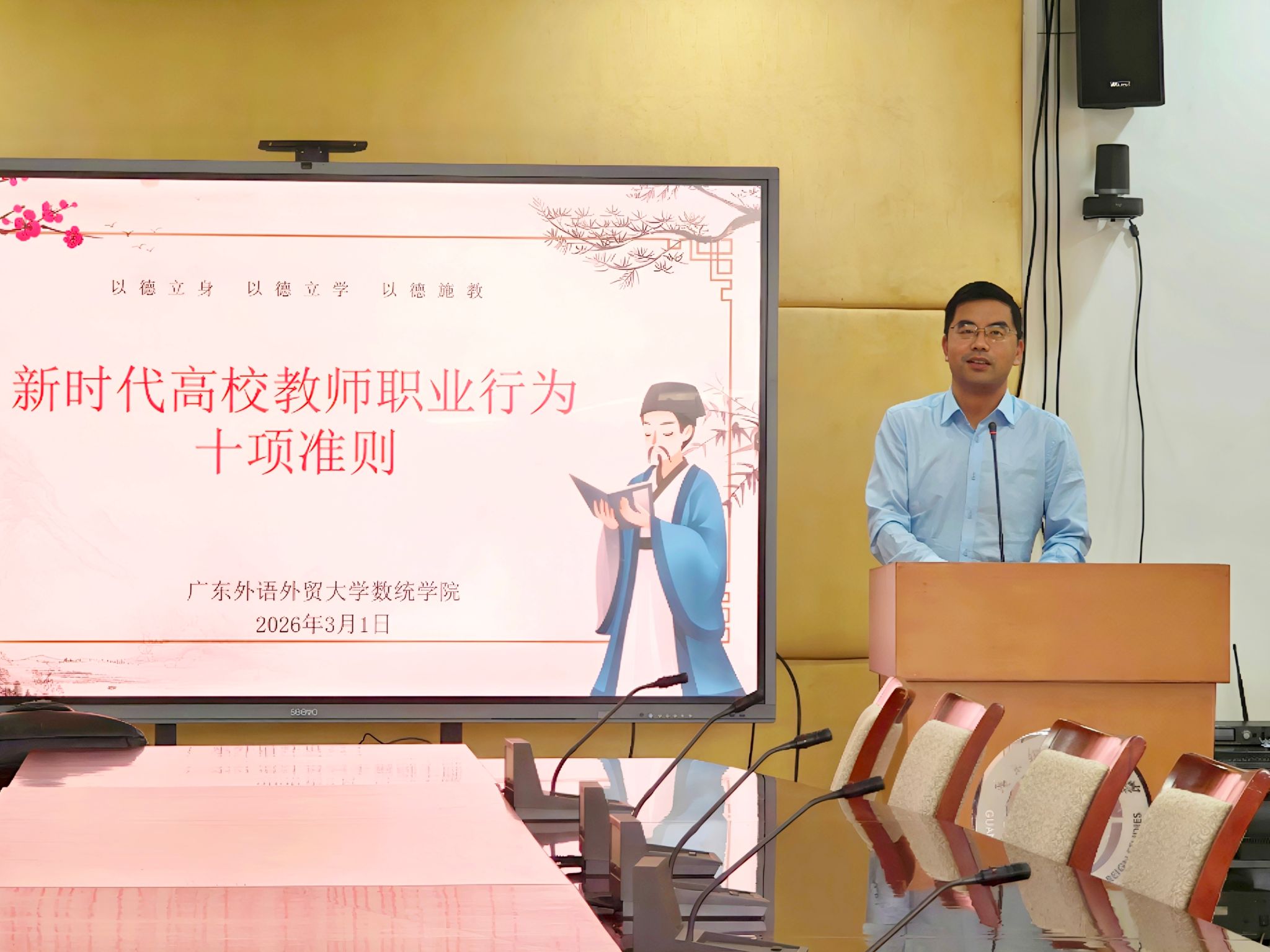 院长王军威围绕“新时代高校教师职业行为十项准则”主题,分析新时代师德师风三大变化,结合教育领域反面典型案例,带领老师们重温《新时代高校教师职业行为十项准则》,强调教职工要严守职业底线、涵养高尚师德,以言传身教为学生成长引路护航。