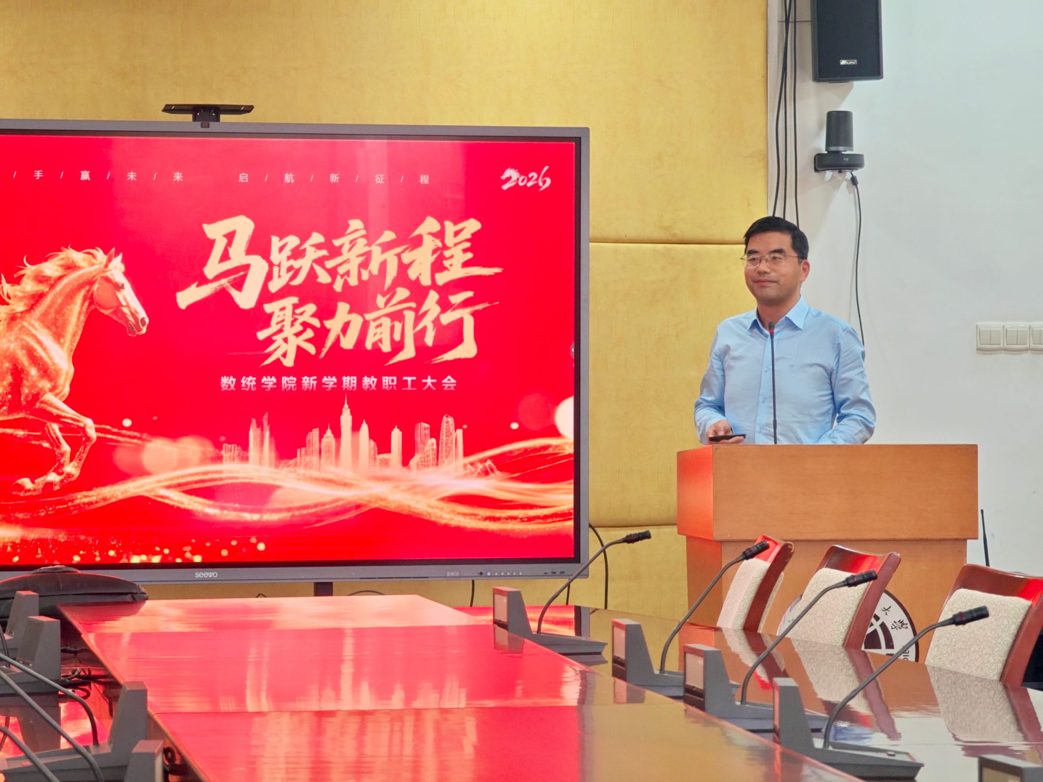 最后,院长王军威作总结讲话。他回顾了 2025 年学院在师资队伍、科研创新、人才培养等方面的亮眼成绩:新增云山讲座教授 2 名、青年博士 2 名,获广东省优秀教学成果奖二等奖1项,发表17 篇二类 A 以上论文,学生在全国统计建模大赛、数学竞赛中斩获国家级奖项 2 项、省级奖项 20 余项,为新学期工作奠定了坚实基础。他强调,新学期正值“十五五”开局起步,全院教职工要进一步凝心聚力、担当作为,以 “一马当先开新局” 的昂扬姿态,紧扣人才培养、学科建设、国际合作等重点任务,补齐发展短板、强化特色优势,推进人才培养质量提升、科研成果突破、国际化办学提质与生源质量优化等工作,以实干实绩推动学院各项工作再上新台阶、实现新跨越。