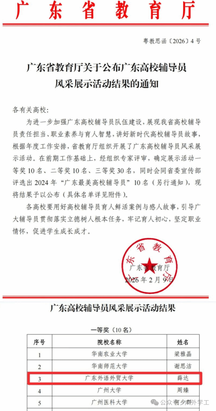 本网讯 近日,广东高校辅导员风采展示活动评选结果正式揭晓,我院辅导员薛达凭借扎实的育人功底、鲜明的职业风采与出色的综合表现,在全省众多选手中脱颖而出,荣获一等奖。